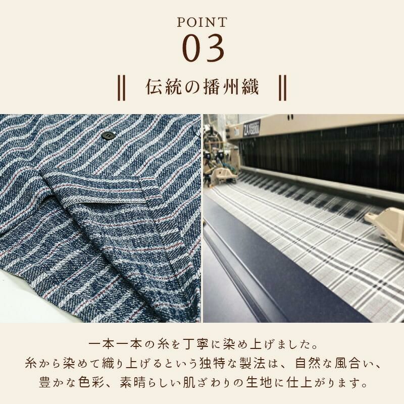 一本一本の糸を丁寧に染め上げました。糸から染めて織り上げるという独特な製法は、自然な風合い、豊かな色彩、素晴らしい肌ざわりの生地に仕上がります。
