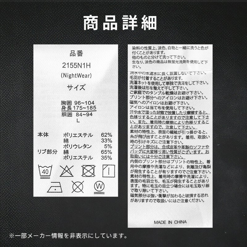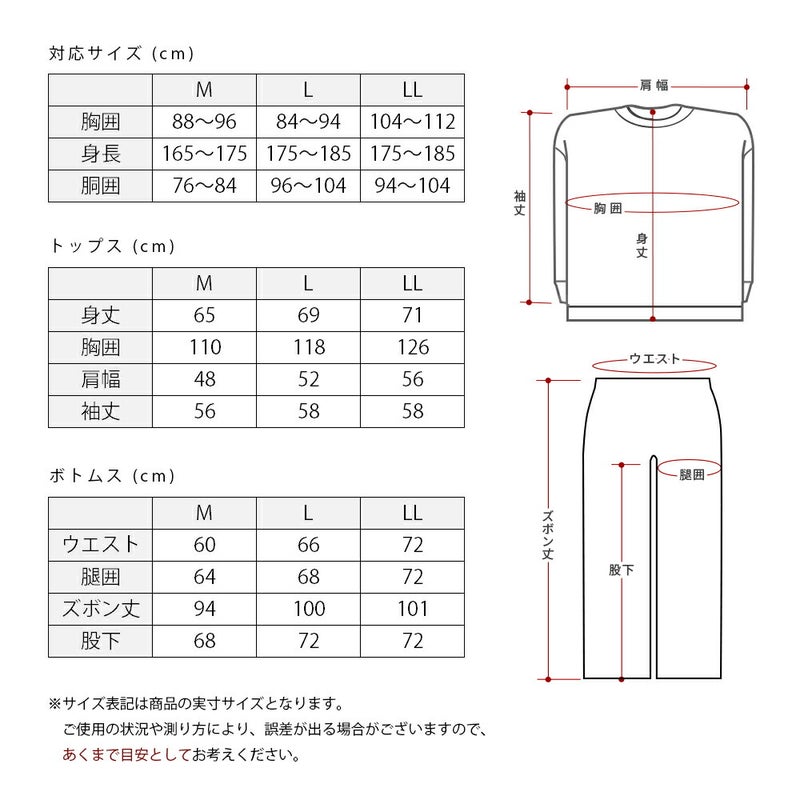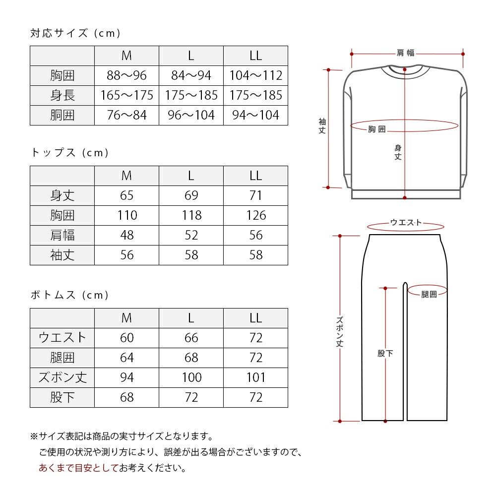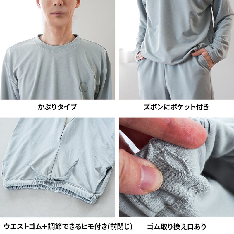 トップスは長袖で、スウェットなのでボタンのないかぶりタイプです。ボトムも長パンツでポケット付きです。ウエストはゴムが入っていますが、紐も付いているので細かい調整が可能です。