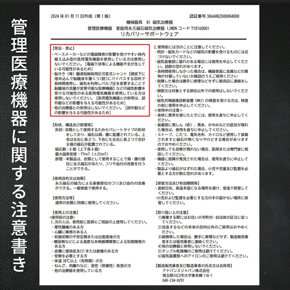 最大磁束密度77ミリステラの磁石を8個、肩と腰の部分に配置しています。磁力によって装着部位の血流を改善してくれます。