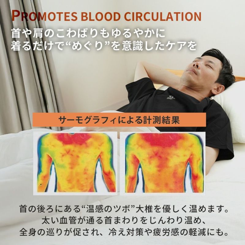 温感のツボ“大椎”を優しく温め、首周りから全身の血流を促進し、冷えや疲労感の軽減に役立つ。