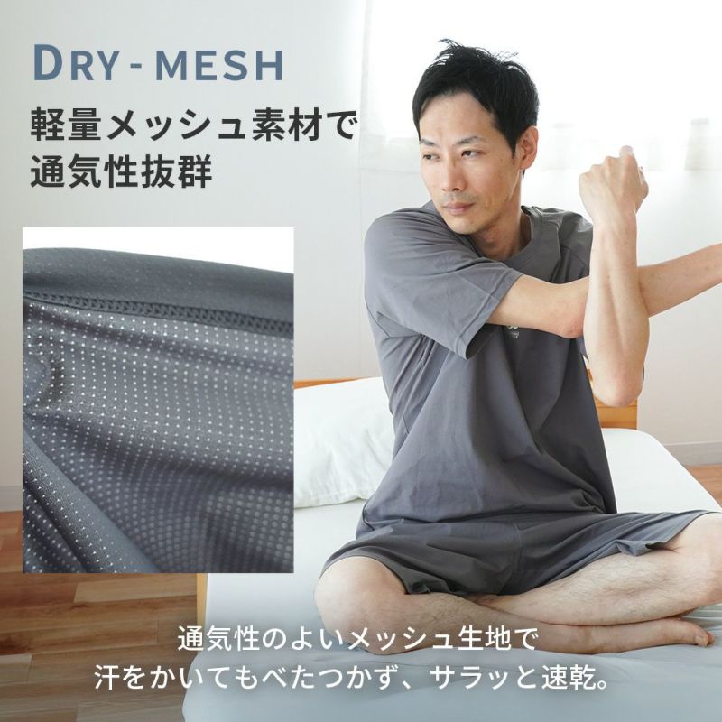 通気性の良いメッシュ生地で汗をかいてもベタつかず、さらりと快適に速乾。