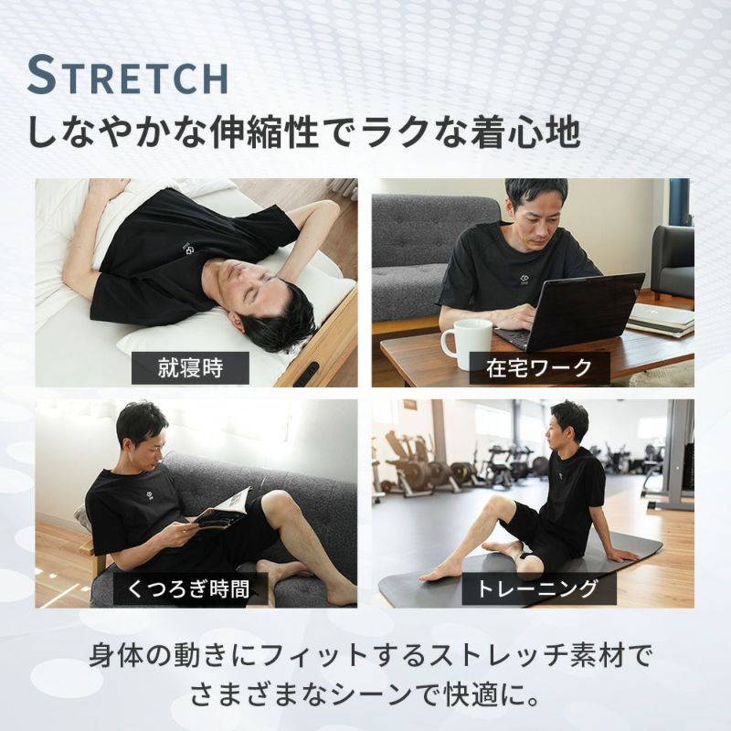 ストレッチ素材が身体の動きにフィットし、就寝・在宅ワーク・くつろぎ時間・トレーニングなど様々なシーンで快適。