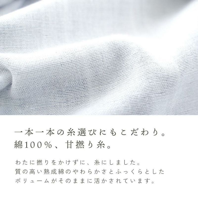 わたに撚りをかけずに、糸にしました。質の高い熟成綿のやわらかさとふっくらとしたボリュームがそのままに活かされています。また、一本一本の糸を丁寧に、職人の手により美しく染め上げました。糸から染めて織り上げるという先染め製法の播州織は、色落ちしにくく、自然な風合い、豊かな色彩、素晴らしい肌触りの生地に仕上がります。
