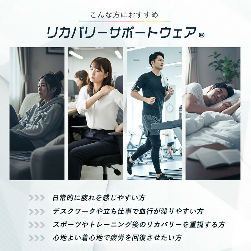 ・血行促進 ・疲労回復 ・筋肉のハリ・コリの緩和 ・筋肉の疲れを軽減 ※リカバリーウェアとは、一般医療機器に分類される「家庭用遠赤外線血行促進用衣」のことです。 上下セットでご着用いただくことで、全身の血行促進を促し、疲労回復へと働きかけます。