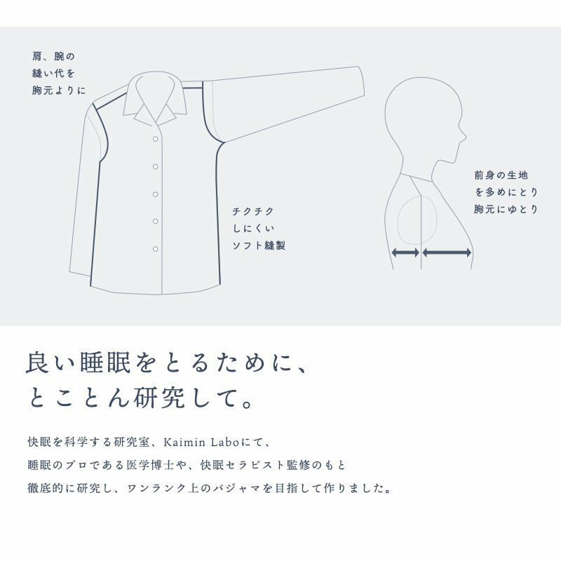 寝る時の姿勢は、通常とは違う部分に重力がかかるため、立っている時と眠る時では体型が異なります。 Kaimin Laboのパジャマは寝返りなども考慮し、身体が締めつけられない独自のパターンで立体的に作られています。
