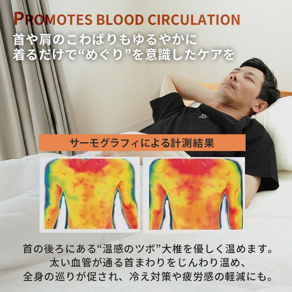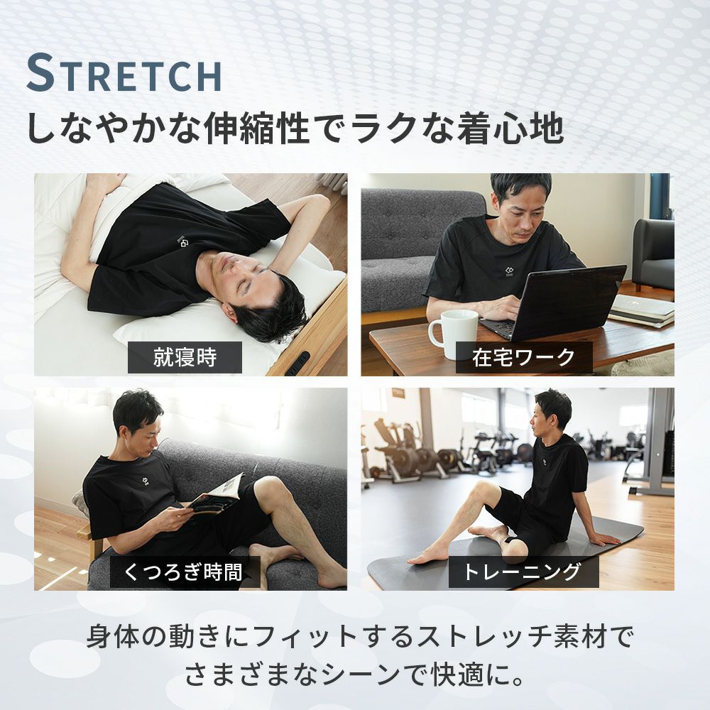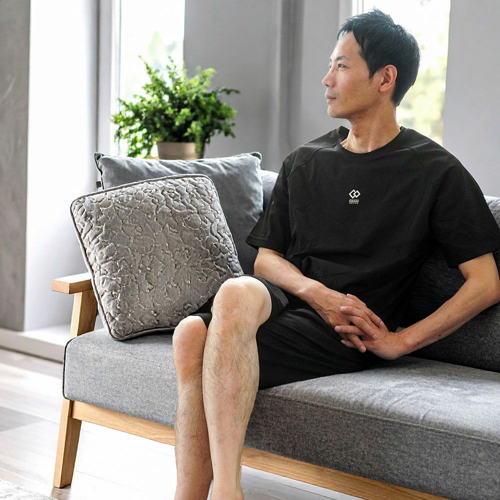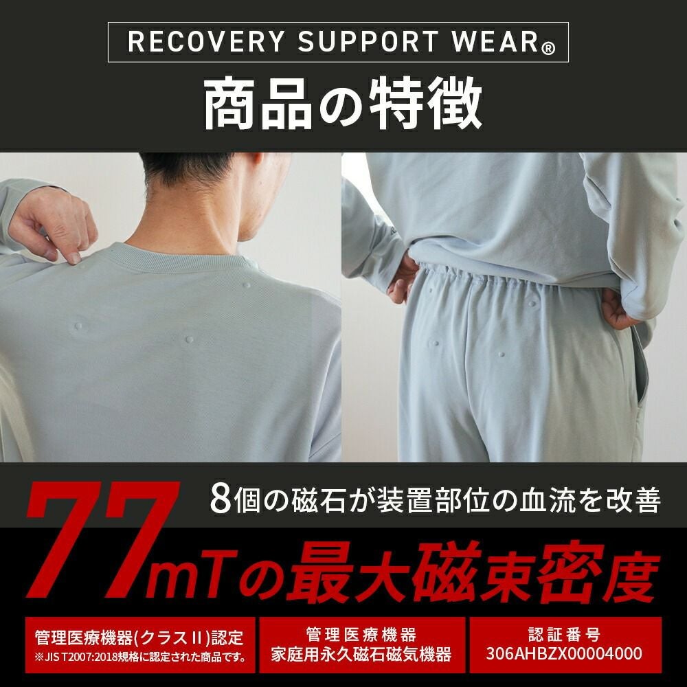 磁石の力で血流を改善。疲れて何もしたくないような時でも着るだけで身体のメンテナンスができるのがリカバリーウェアの良いところです。理由は肩と腰に設置された8個の磁石が血流を改善してくれるから。動きを妨げないゆったりとしたシルエットは寝心地も抜群です。