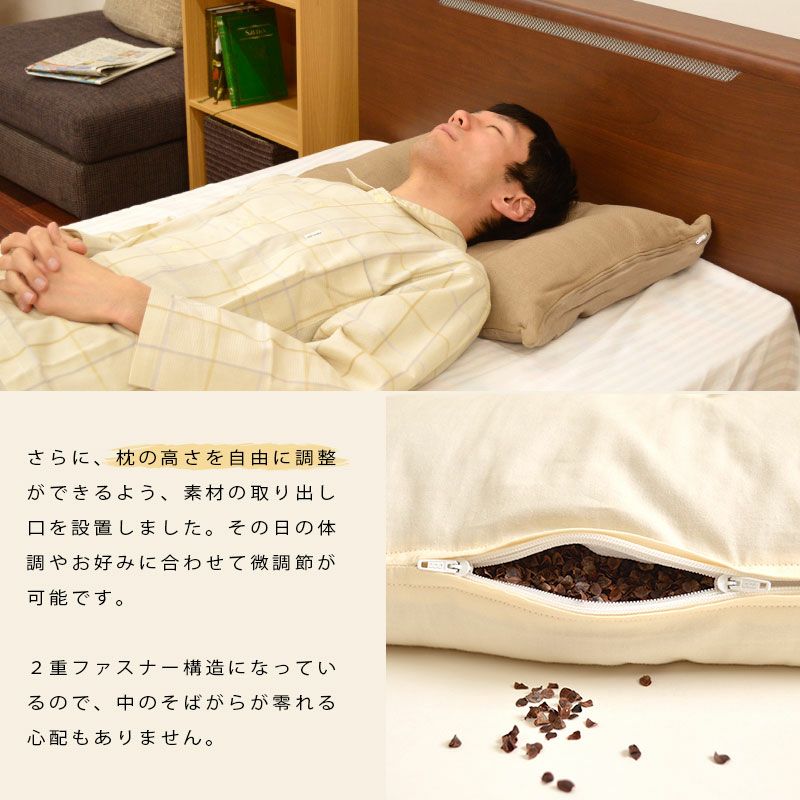 中材を取り出して高さの調節も可能。2重ファスナー構造になっているので、中のそば殻が零れる心配もありません。