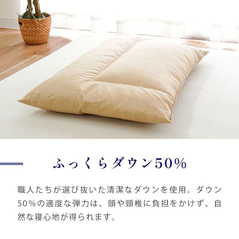 職人たちが選び抜いた清潔なダウンを使用。ダウン50%の適度な弾力は、頭や頸椎に負担をかけず、自然な寝心地が得られます。 また、ダウン量を600gにすることで比較的万人受けしやすい寝心地に。羽毛が頭部を優しく包み込み、底付き感もありません。男性にも女性にも合わせやすい枕です。
