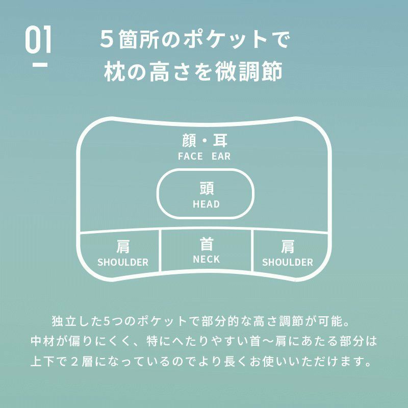 クーシェは5つに分かれたポケットから中材を出し入れすることで、セミオーダー枕並みの部分的な細かな高さ調整が可能です。中材が偏りにくく、特にへたりやすい首~肩にあたる部分は上下で2層になっているので、より長くお使いいただけます。