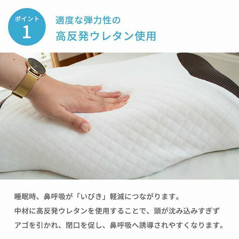 中材に高反発ウレタンを使用することで、頭が沈み込みすぎず、顎を引かれ、閉口を促し、鼻呼吸へ誘導されやすくなります。