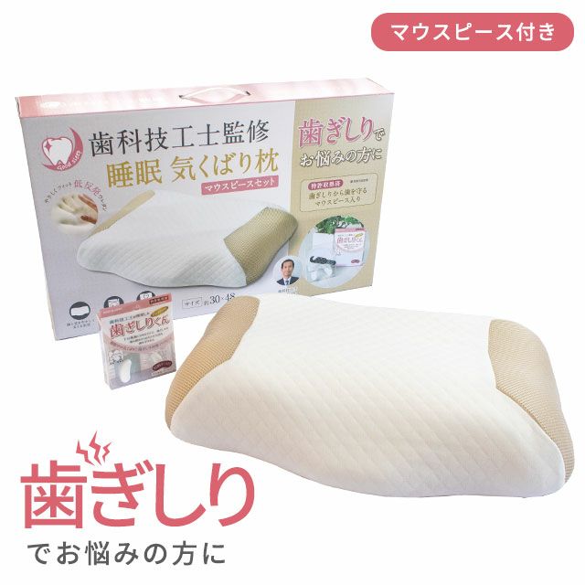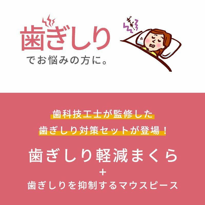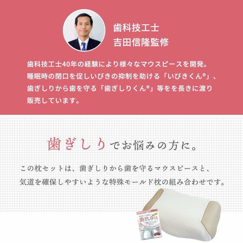 歯ぎしりから歯を守るマウスピースと、気道を確保しやすい特殊モールド枕の組み合わせです。