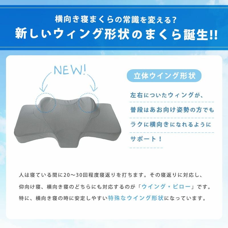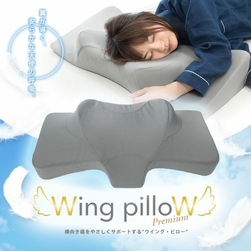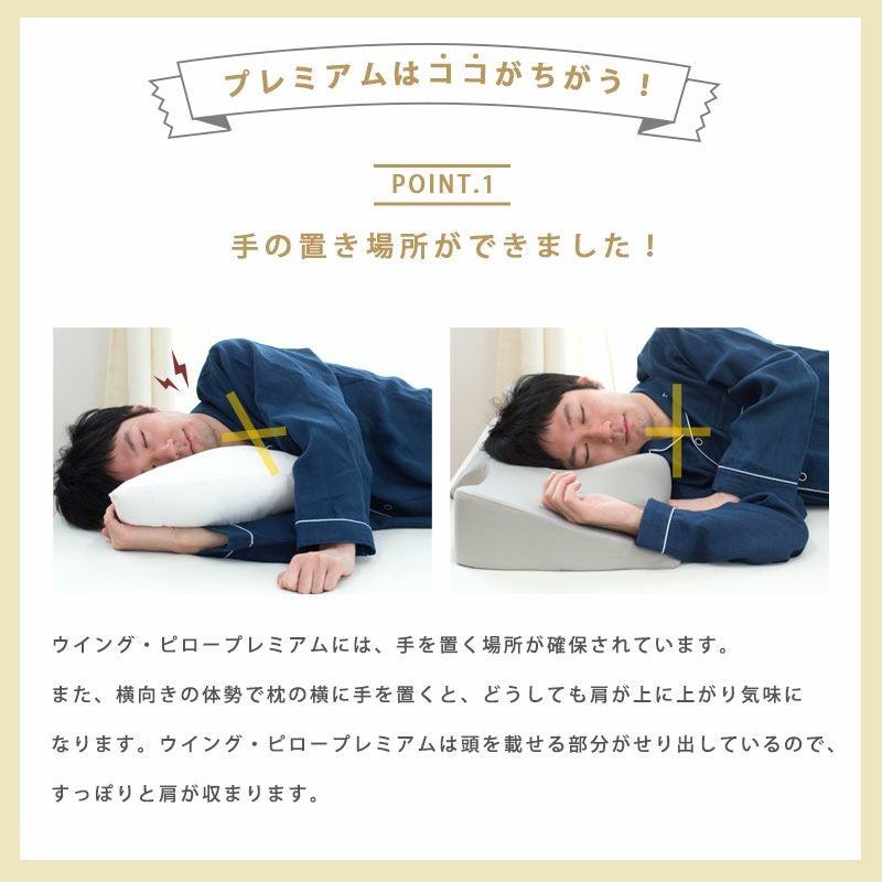 「WingPillow(ウイング・ピロー)プレミアム」。特徴的な「立体ウィング形状」により、横向き寝、仰向け寝両方に対応するので、理想の寝姿勢をキープしつつ、自然な寝返りをサポート。スタンダードモデルとの違いは、カタチにあり。すっぽりと肩が収まる形で手の置き場所があります。また、ワイドサイズで寝返りをしても頭が枕から落ちません。上下両側2wayで使えるのもポイント。