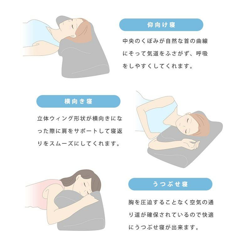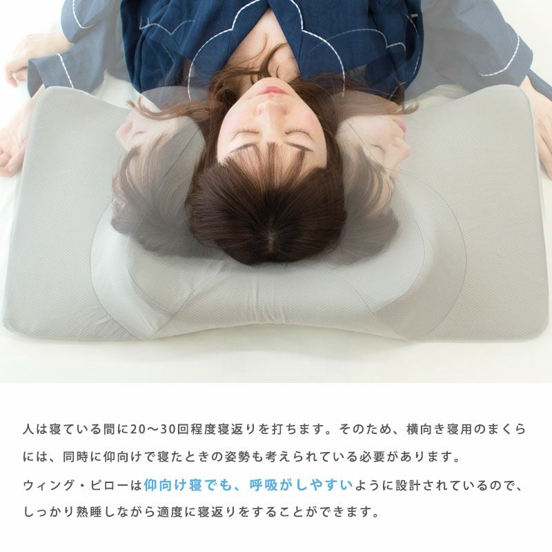 人は寝ている間に20~30回程度寝返りを打ちます。そのため、横向き寝用の枕には、同時に仰向けで寝たときの姿勢も考えられている必要があります。寝姿勢がいかに良くとも、その状態で寝返りができないと、身体の同じ箇所に絶えず圧力がかかっているので、血行が悪くなり、逆に身体の痛みや起きたときの疲労に繋がります。ウイングピローは仰向け寝でも、呼吸がしやすいように設計されているので、しっかり熟睡しながら適度に寝返りをすることができます。