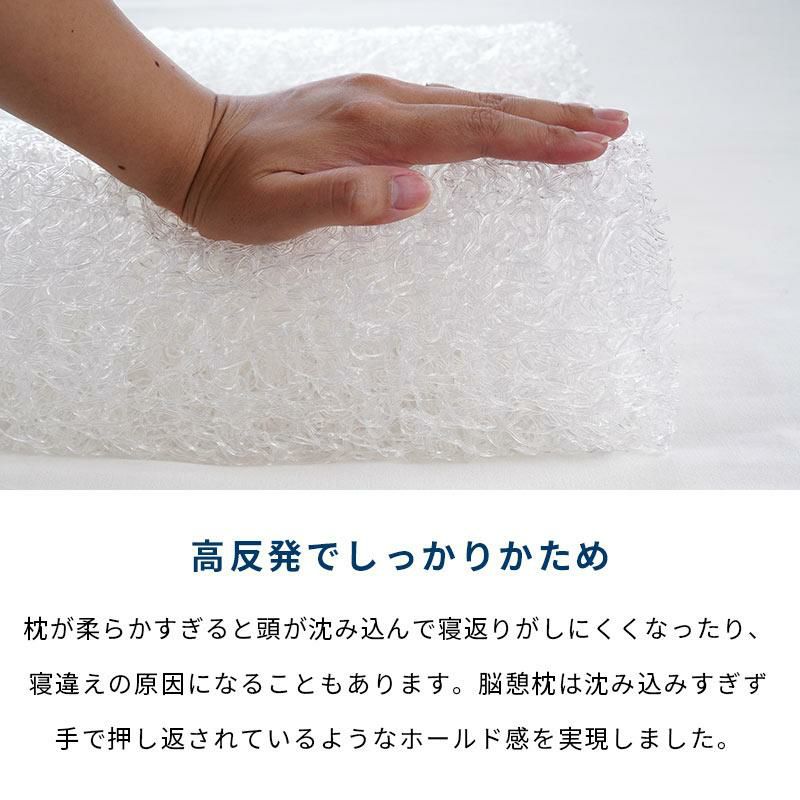 枕が柔らかすぎると頭が沈み込んで寝返りがしにくくなったり、寝違えの原因になることもあります。脳憩枕は沈み込みすぎず手で押し返されているようなホールド感を実現しました。