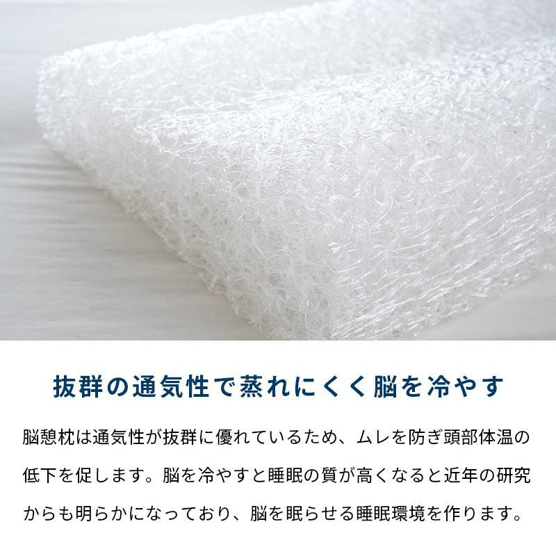 脳憩枕は通気性が抜群に優れているため、ムレを防ぎ頭部体温の低下を促します。脳を冷やすと睡眠の質が高くなると近年の研究からも明らかになっており、脳を眠らせる睡眠環境を作ります。