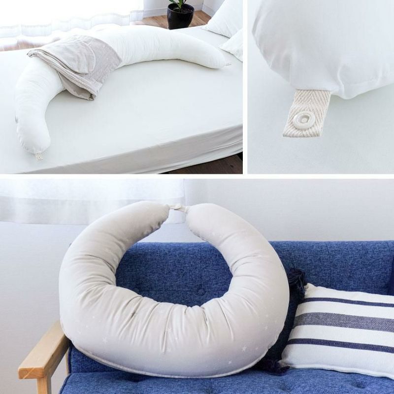 お腹に寄り添う形。ゆるいカーブが妊婦さんのお腹にやさしく寄り添い横向き寝をサポートします。ボタンをするとドーナツ型に早変わり!
