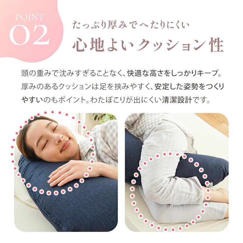 頭の重みで沈みすぎることなく、快適な高さをしっかりキープ。厚みのあるクッションは足を挟みやすく、安定した姿勢をつくりやすいのもポイント。わたぼこりが出にくい清潔設計です。