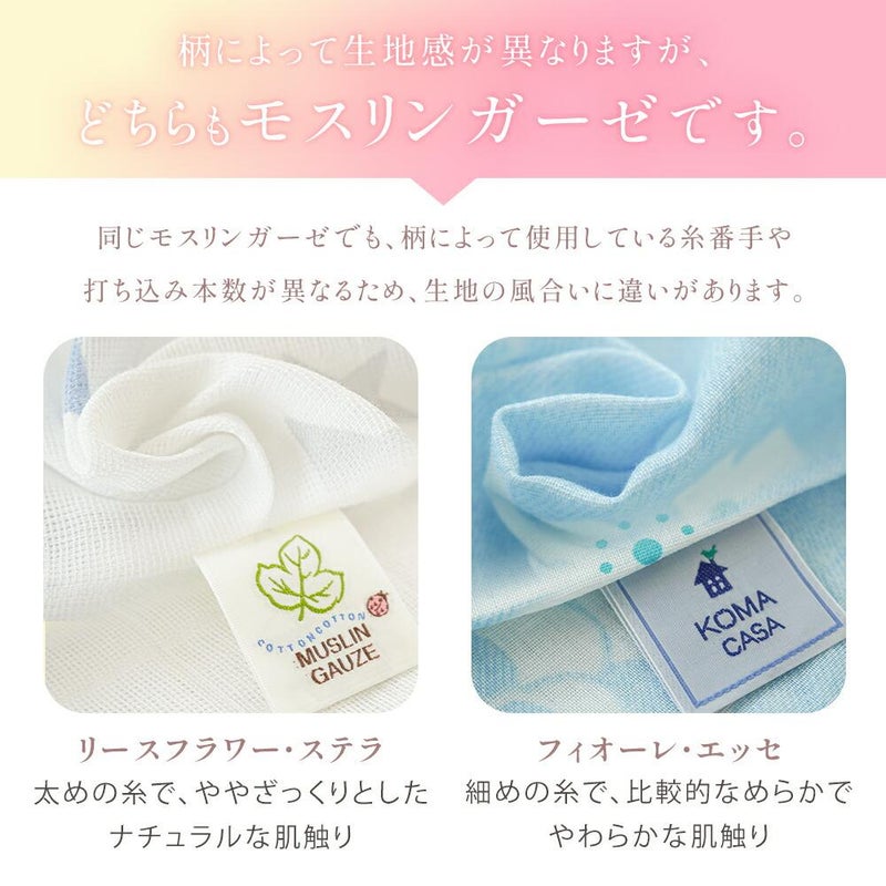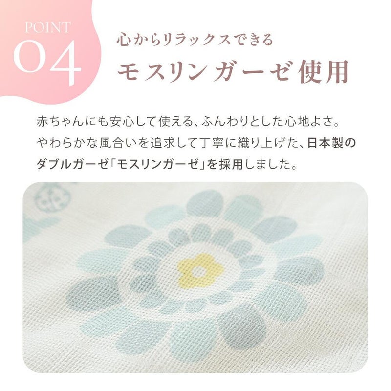 赤ちゃんにも安心して使える、ふんわりとした心地よさ。やわらかな風合いを追求して丁寧に織り上げた、日本製のダブルガーゼ「モスリンガーゼ」を採用しました。