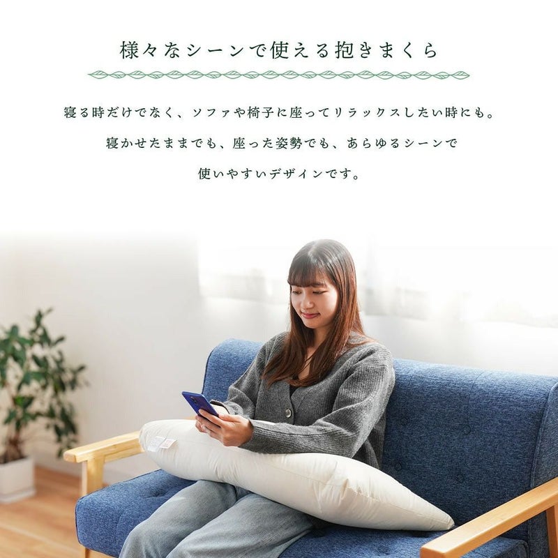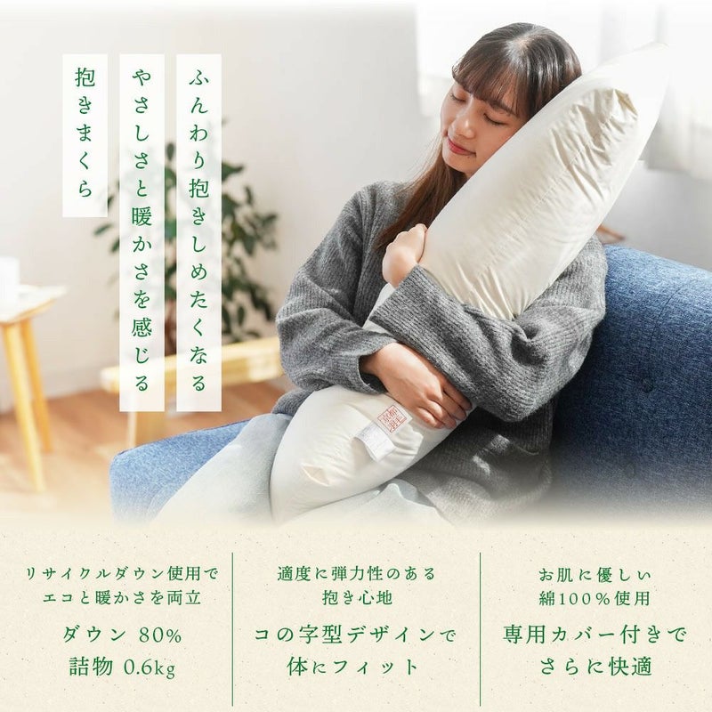 洗浄した清潔なリサイクルダウンを使用。ダウン80%のふっくらとした羽毛ならではの弾力と温かさを感じられます。中の羽毛は1枚分の合い掛け布団に相当を使用することで、高い保温性と弾力性のある抱き枕となっています。