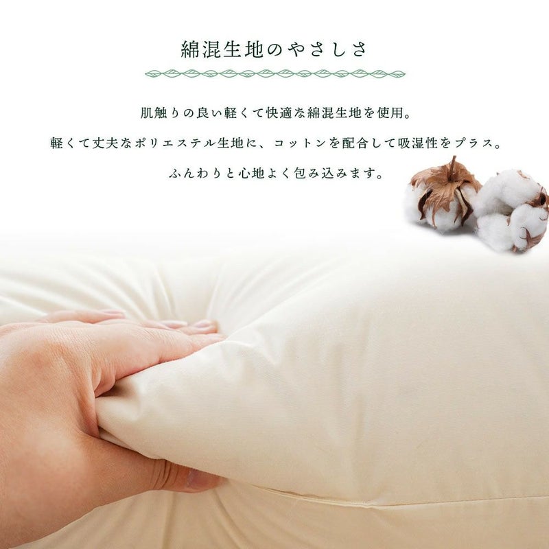 肌触りの良い軽くて快適な綿混生地を使用。軽くて丈夫なポリエステル生地に、コットンを配合して吸湿性をプラス。ふんわりと心地よく包み込みます。