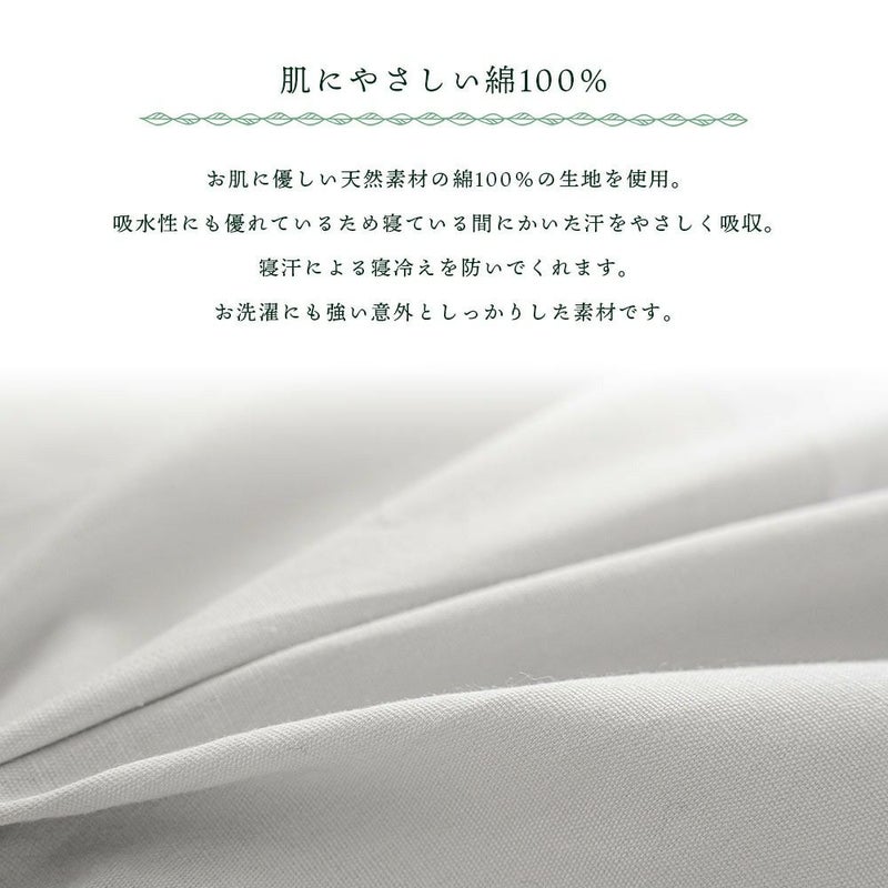 お肌に優しい天然素材の綿100%の生地を使用。吸水性にも優れているため寝ている間にかいた汗をやさしく吸収。寝汗による寝冷えを防いでくれます。お洗濯にも強い意外としっかりした素材です。