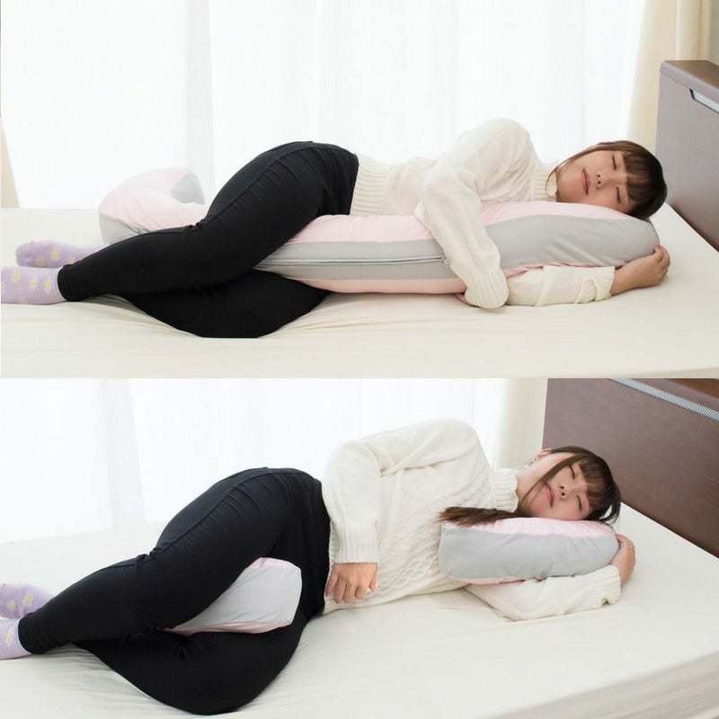 横向き寝をサポート。左右どちらを向いてもお使いいただけます。腰に巻きつければ、授乳枕や腰枕としても使えます。