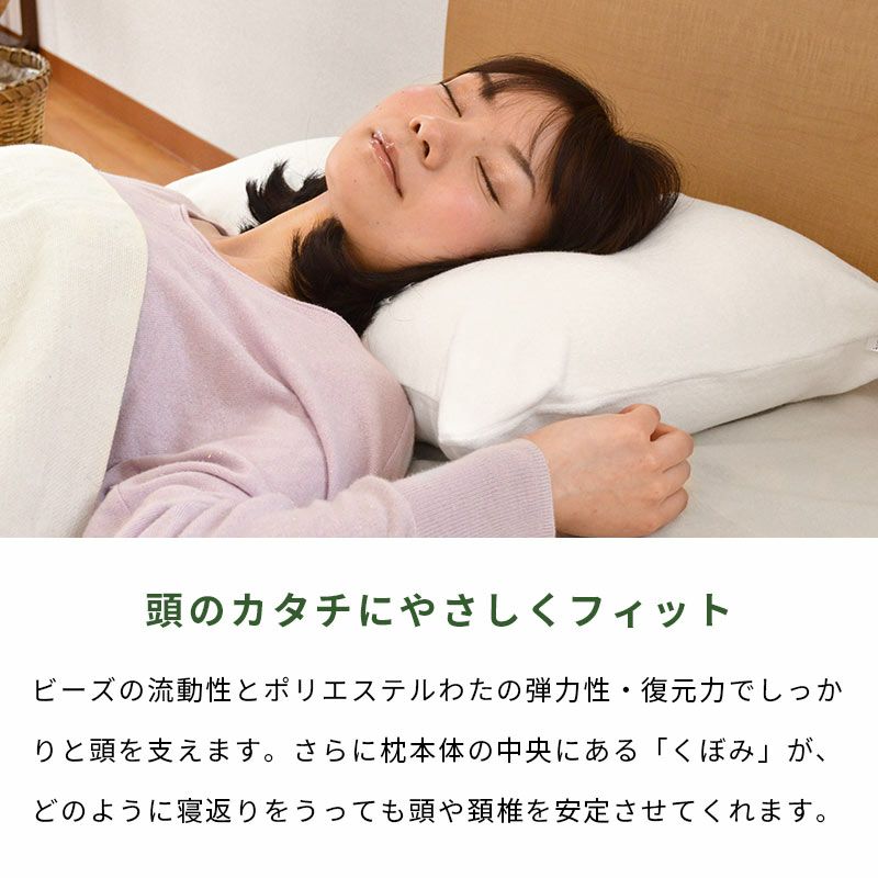 ビーズの流動性とポリエステルわたの弾力性・復元力でしっかりと頭を支えます。さらに枕本体の中央にある「くぼみ」が、どのように寝返りをうっても頭や頚椎を安定させてくれます。