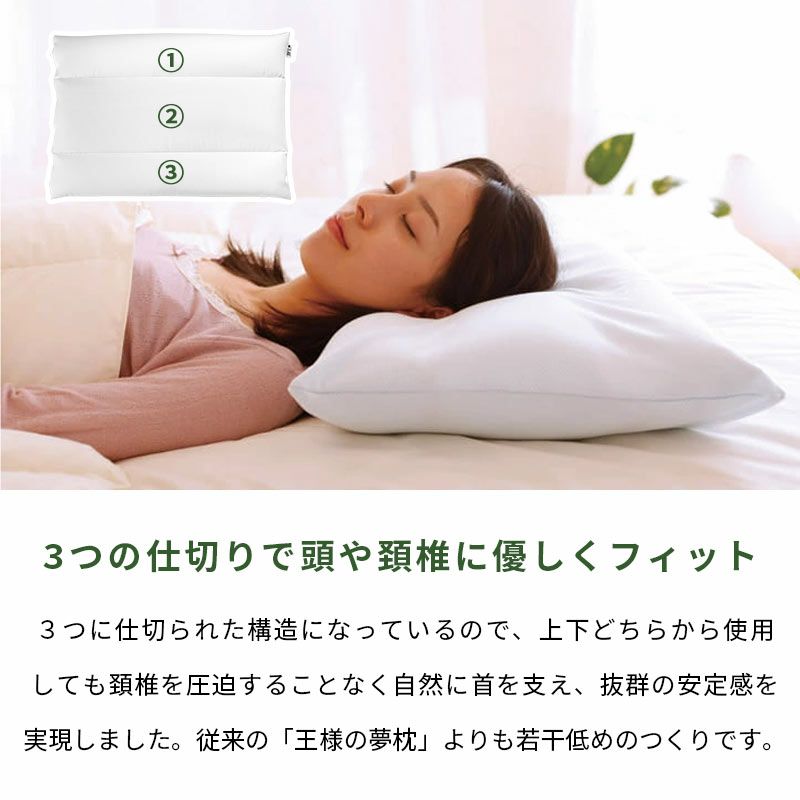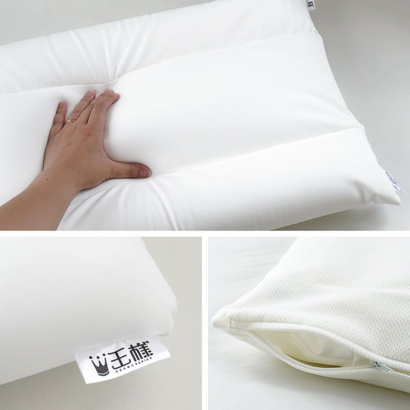 3つに仕切られた構造になっているので、上下どちらから使用しても頚椎を圧迫することなく自然に首を支え、抜群の安定感を実現しました。従来の「王様の夢枕」よりも若干低めのつくりです。