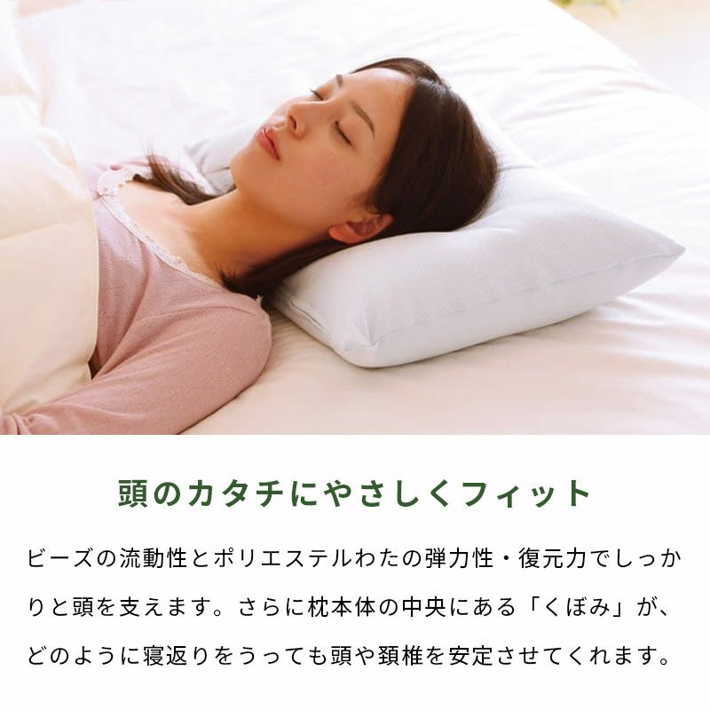 ビーズの流動性とポリエステルわたの弾力性・復元力でしっかりと頭を支えます。さらに枕本体の中央にある「くぼみ」が、どのように寝返りをうっても頭や頚椎を安定させてくれます。