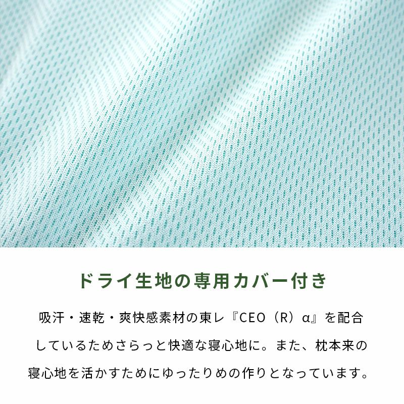 吸汗・速乾・爽快感素材の東レ『CEO(R)α』を配合しているためさらっと快適な寝心地に。また、枕本来の寝心地を活かすためにゆったりめの作りとなっています。