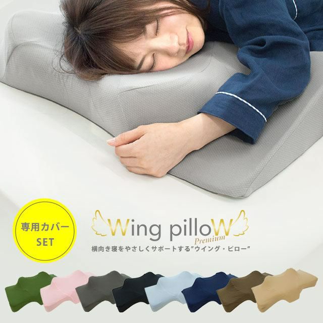 「横向き寝枕ウイング・ピロープレミアム」と「専用カバー」のセット。特徴的な「立体ウィング形状」により、横向き寝、仰向け寝両方に対応するので、理想の寝姿勢をキープしつつ、自然な寝返りをサポート。スタンダードモデルとの違いは、カタチにあり。すっぽりと肩が収まる形で手の置き場所があります。また、ワイドサイズで寝返りをしても頭が枕から落ちません。上下両側2wayで使えるのもポイント。専用カバーは、その独特な形にしっかりとフィットします。