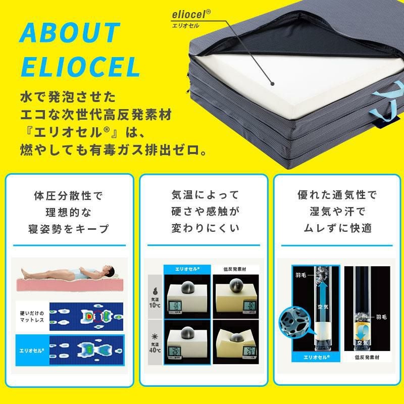 人の健康と地球環境に配慮してつくられたSDGsマットレスです。中芯の「エリオセル®」は、水で発泡させた次世代高反発フォームで、生成過程において人体や地球環境に有害な物質を使用しないこと、また燃焼させても有毒なガスが発生しないことから、 世界的なエコロジー認定機関であるエコテックス® スタンダード100の認証を取得しています。プラスチック素材や金属を使用せず、また『真空ロールアップ製法』により輸送時の温室効果ガスの排出も減らします。