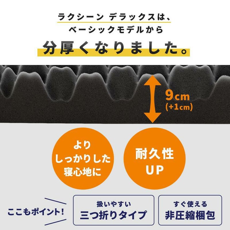 ラクシーン デラックスは、ベーシックモデルから分厚くなりました。そのため、寝心地が向上し、耐久性もアップしました。扱いやすい三つ折りタイプで、届いてすぐ使える非圧縮梱包なのもポイント!