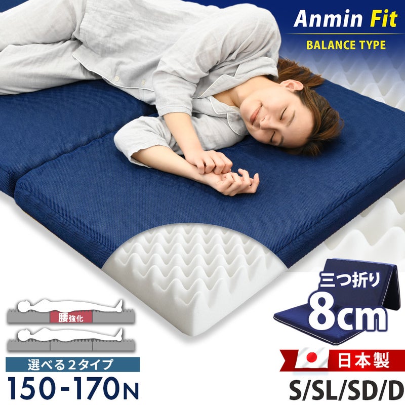 自社工場製造の安心品質。選べる2タイプの硬さ(均一・腰部強化)と凸凹プロファイル構造で体圧分散を促し、理想の寝姿勢をサポートする高反発三つ折りマットレス「Anmin Fit」。 高反発マットレス 三つ折り 日本製 Anmin Fit 厚さ8cm 選べる2タイプ(硬さ均一/腰部硬め) プロファイル 体圧分散 敷き布団