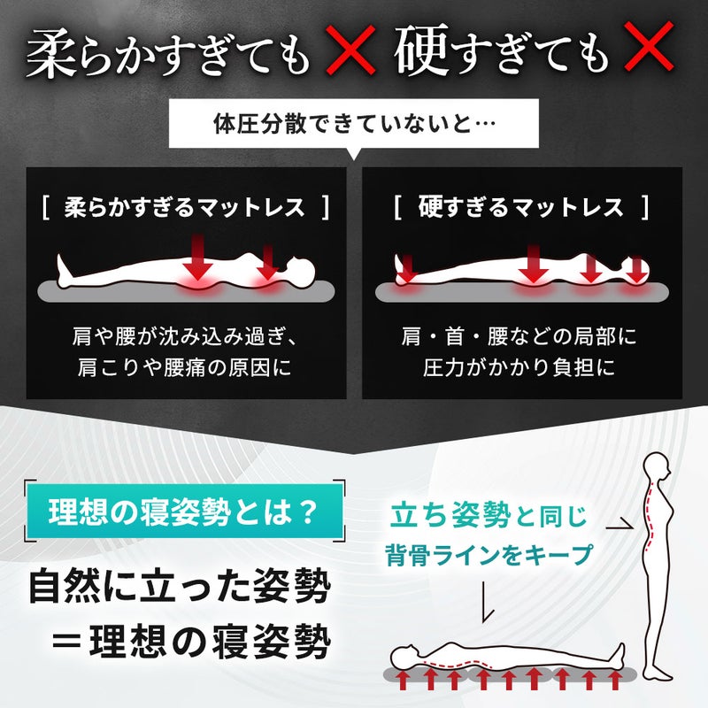 体重が一番かかる中央部分を硬めに設計した腰部強化タイプは、沈み込みを防いで理想的な寝姿勢をサポート。毎朝の腰や背中の違和感にお悩みの方に寄り添う設計です。