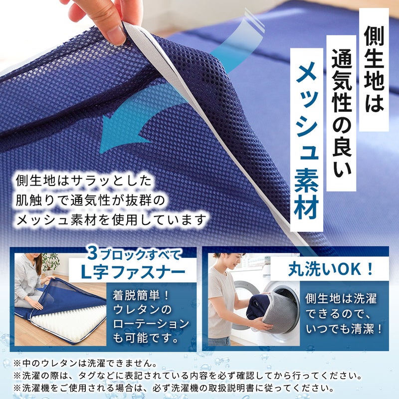 就寝中の湿気も発散しやすく、一年中快適にお休みいただけます。さらに、側生地はご自宅の洗濯機で丸洗いが可能です。L字型に大きく開くファスナーで着脱も簡単なので、衛生面が気になる方にも安心してお使いいただけます。
