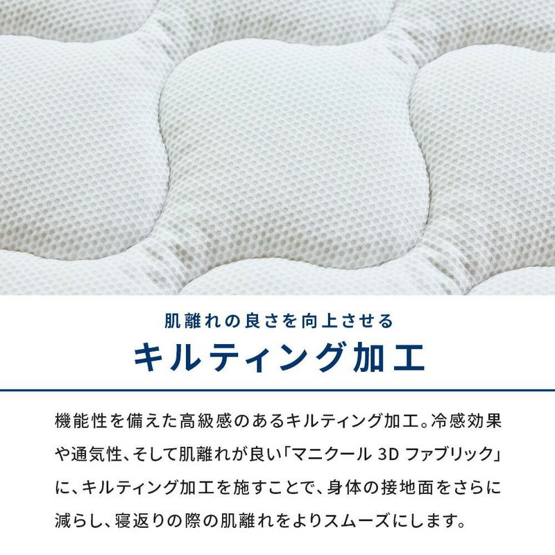 機能性を備えた高級感のあるキルティング加工。冷感効果や通気性、そして肌離れが良い「マニクール3Dファブリック」に、キルティング加工を施すことで、身体の接地面をさらに減らし、寝返りの際の肌離れをよりスムーズにします。
