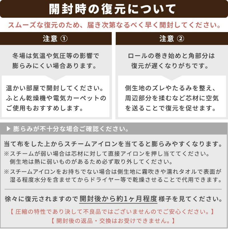製品は、筒状の袋に梱包された後圧縮が行われ、さらに外側からエチレンシートで包まれた衛生的な2重梱包となっています。圧縮時に内袋は破けることが御座いますが、衛生的には全く問題御座いませんのでご安心くださいませ。