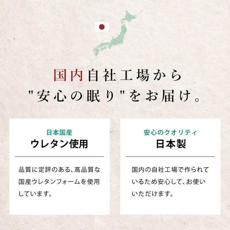 熟練の職人が管理する製造ラインで、安全性と耐久性を追求しました。毎日肌に触れ、身体を長時間預ける寝具だからこそ、安心してお使いいただけるメイド・イン・ジャパンの品質にこだわっています。