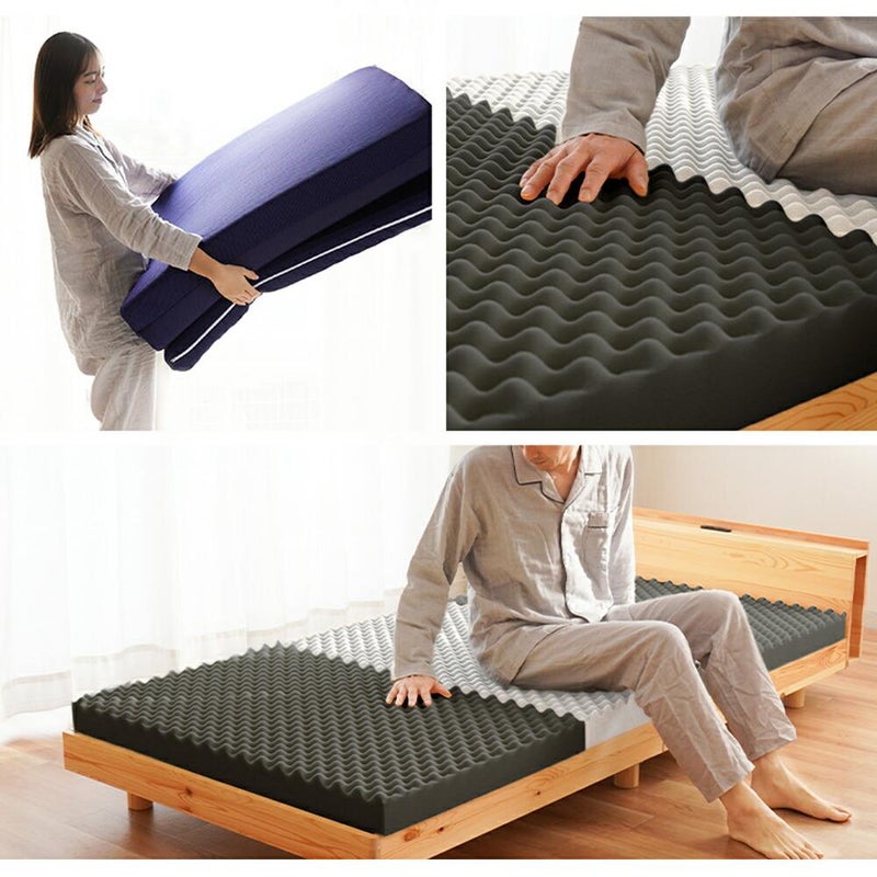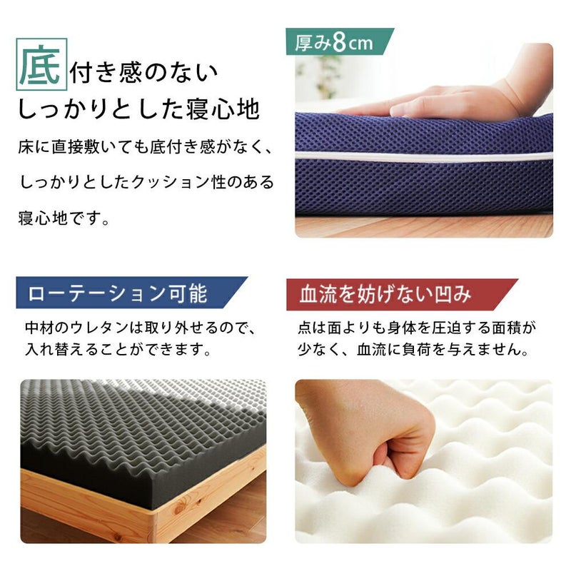 面で支えるタイプに比べ、身体との接触面積を減らすことで通気性を確保し、睡眠中の湿気や熱も効率よく逃がします。厚さ8cmながら底付き感がなく、これ一枚で畳やフローリングに直接敷いてもしっかりとした寝心地を体感いただけます。