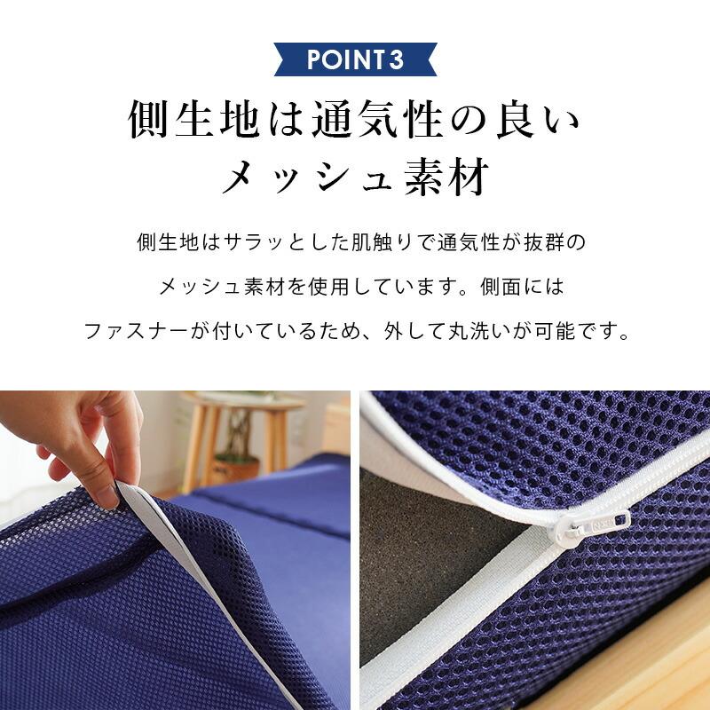 側面には大きく開くL字ファスナーを搭載し、中のウレタンを取り出しやすい設計にしました。側生地はご自宅の洗濯機で丸洗いができるので、汗や汚れが気になる時期でも常に清潔な睡眠環境を保つことができます。