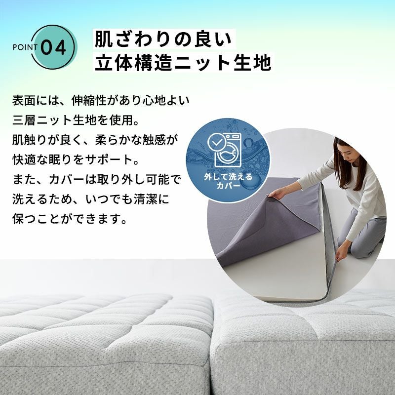 表面には、伸縮性があり心地よい三層ニット生地を使用。肌触りが良く、柔らかな触感が快適な眠りをサポート。 また、カバーは取り外し可能で洗えるため、いつでも清潔に保つことができます。