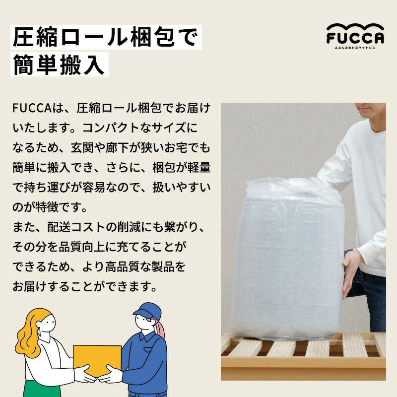FUCCAは、圧縮ロール梱包でお届けいたします。コンパクトなサイズになるため、玄関や廊下が狭いお宅でも簡単に搬入でき、さらに、梱包が軽量で持ち運びが容易なので、扱いやすいのが特徴です。 また、配送コストの削減にも繋がり、その分を品質向上に充てることができるため、より高品質な製品をお届けすることができます。