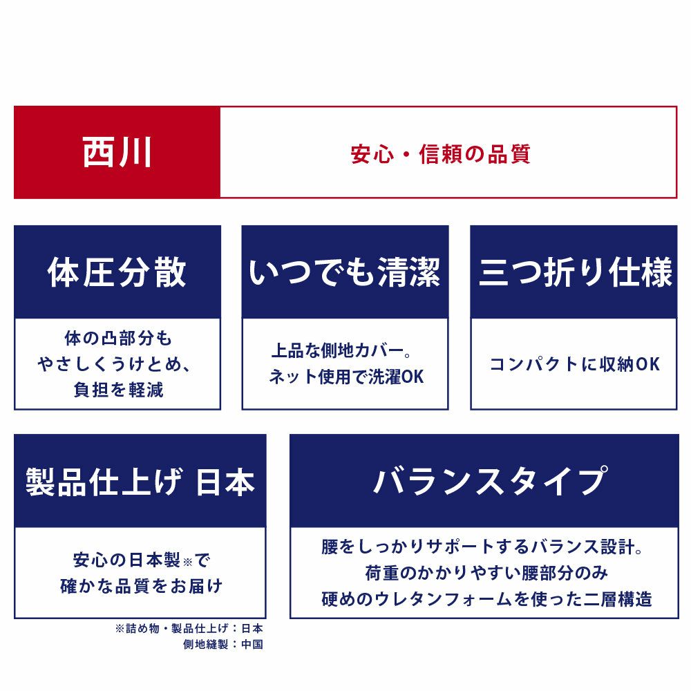 他の画像を見る 即日発送 当社限定 西川 点で支えるマットレス 【ギャル曽根さんが体験した】西川 安眠工房 点で支える 健康敷きふとん 三層タイプ 三つ折り マットレス 折りたたみ ¥ 99,000 税込 〜 ¥ 税込 お気に入りに登録する