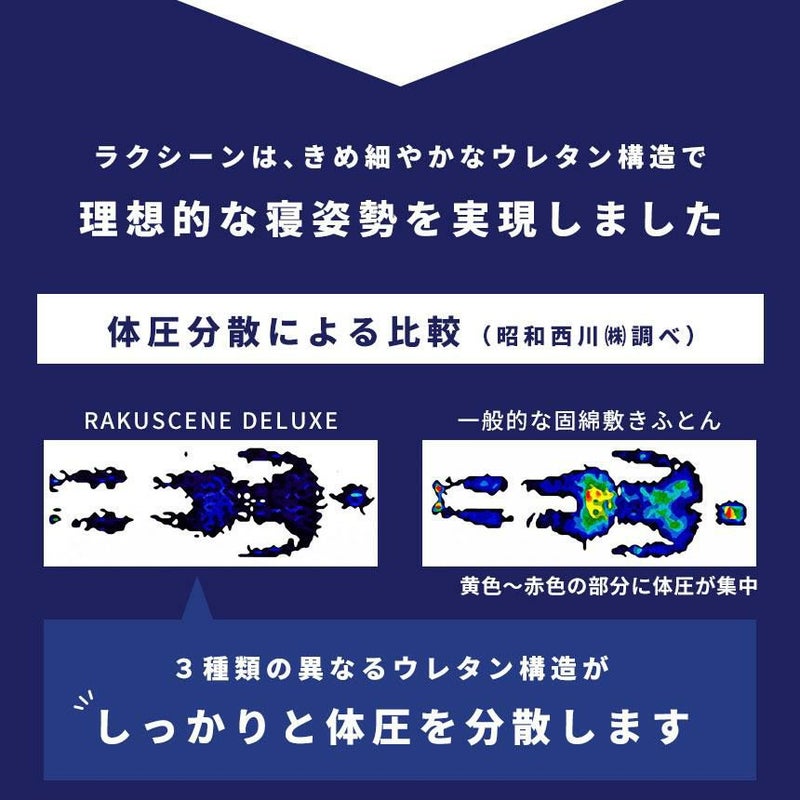ラクシーンマットレスは、身体の重量に合わせたウレタンの硬さで寝姿勢を支えます。3種類の異なるウレタン構造で理想的な寝姿勢を実現、しっかりと体圧を分散します。