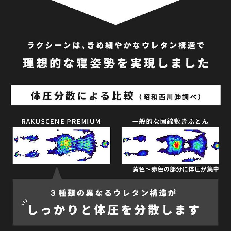 ラクシーン プレミアムは、デラックスモデルから2層になり、さらに分厚くなりました。ラクシーン ベーシックやデラックスにはなかった下層のウレタンが湿気を拡散!さらにクッション性・寝心地が向上し、耐久性もアップしました。扱いやすい三つ折りタイプで、届いてすぐ使える非圧縮梱包なのもポイント!