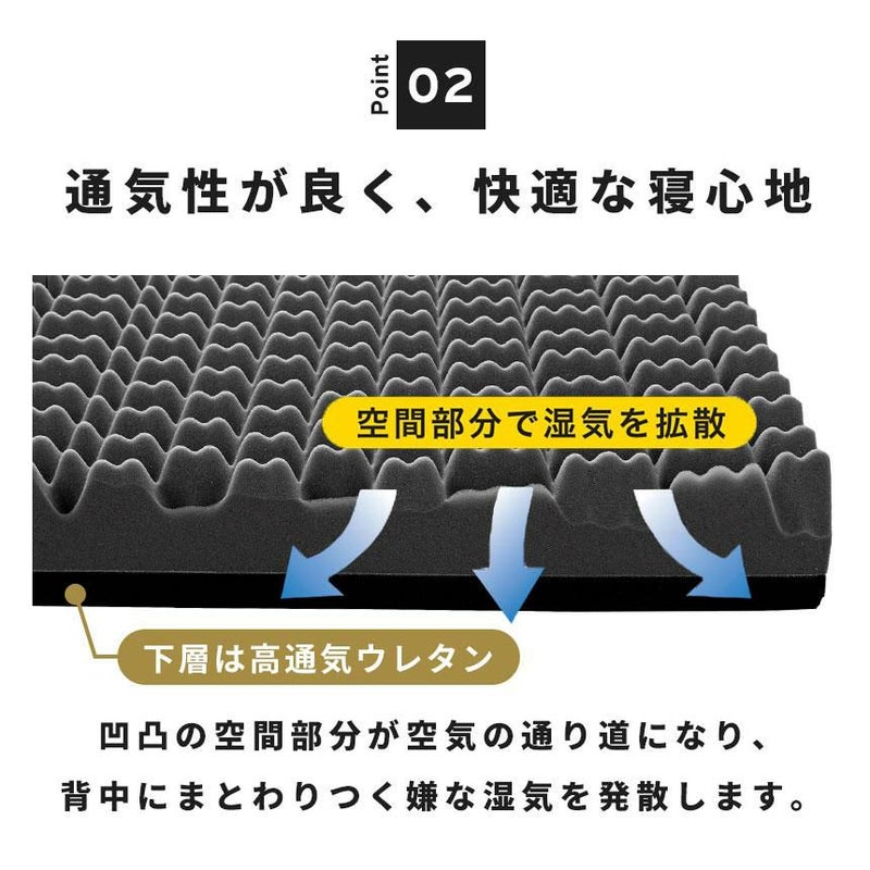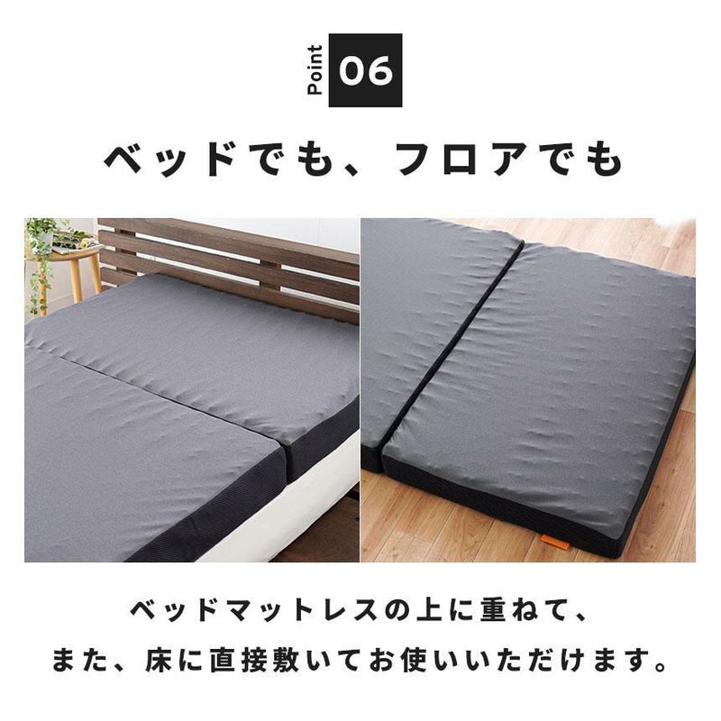 ベッドマットレスの上に重ねて、また、床に直接敷いてお使いいただけます。折りたたみ簡単な三つ折りタイプ。使わないときは立てかけるだけで湿気対策になります。