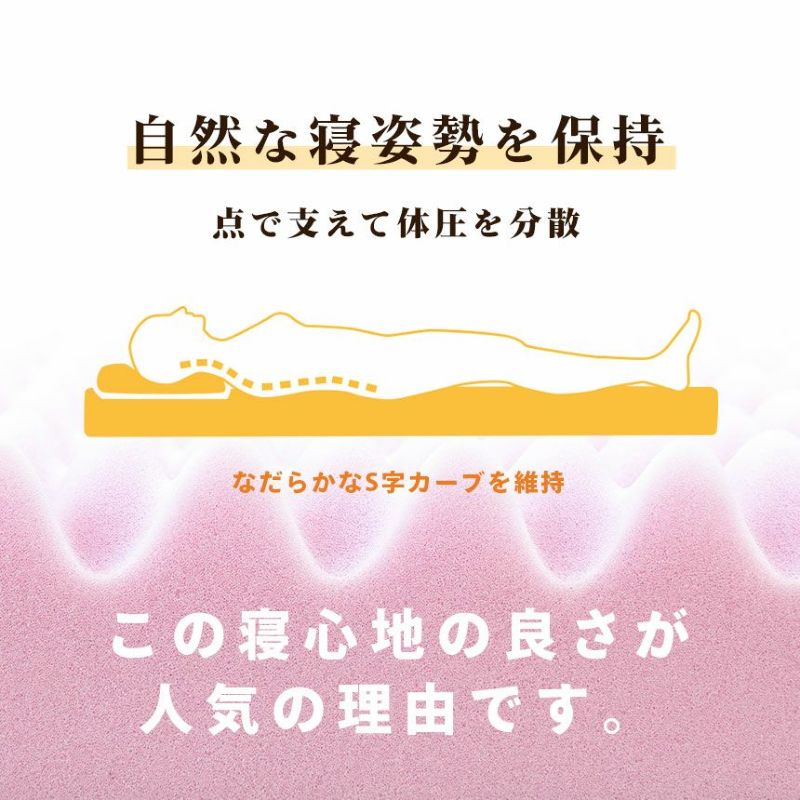 体のことを考えたしっかりめの硬さです。数値上では200ニュートンと硬めの敷きふとんになりますが、凹凸があるため、適度な沈み込みがあります。上層部の凹凸が体のラインに沿うように体を優しく受け止め、フラットな下層部で身体をしっかり支えます。沈み込みすぎず、寝返りがしやすくなっています。寝返りをすることで血行を促し、体の負担を軽減するとともに、体と敷き布団の間にある湿気を発散させることができます。この寝心地の良さが人気の理由です。