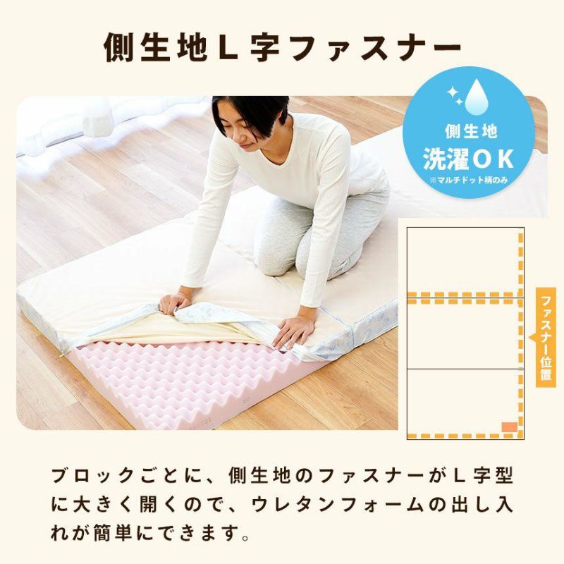 ブロックごとに、側生地のファスナーがL字に大きく開くので、ウレタンフォームの出し入れが簡単にできます。 多くの場合、長年使用していくと腰を支える周辺からヘタリが生じてきます。しかし中材のウレタンを取り出して他の場所と交換できるので、定期的にヘタったブロックとヘタっていないブロックの入れ替えが可能です。つまり、フラットタイプよりも長くいい状態でお使いいただけます。