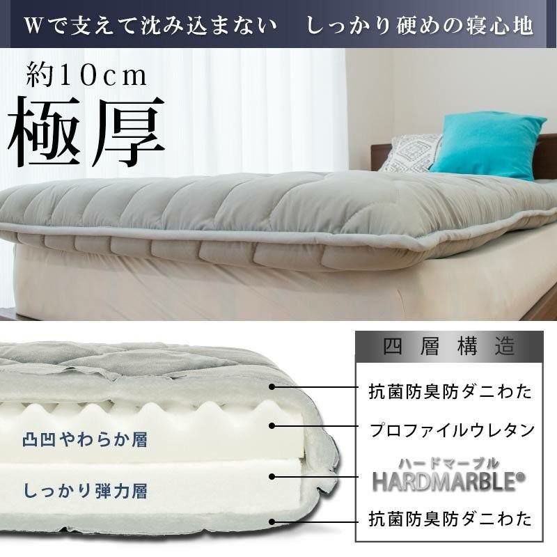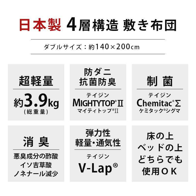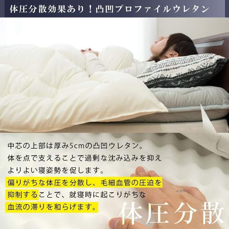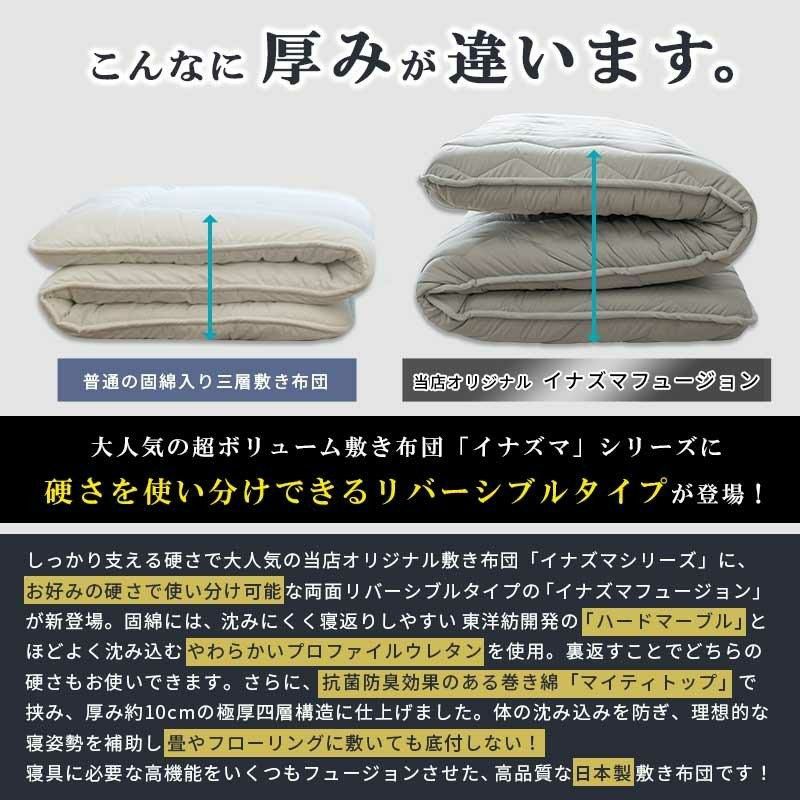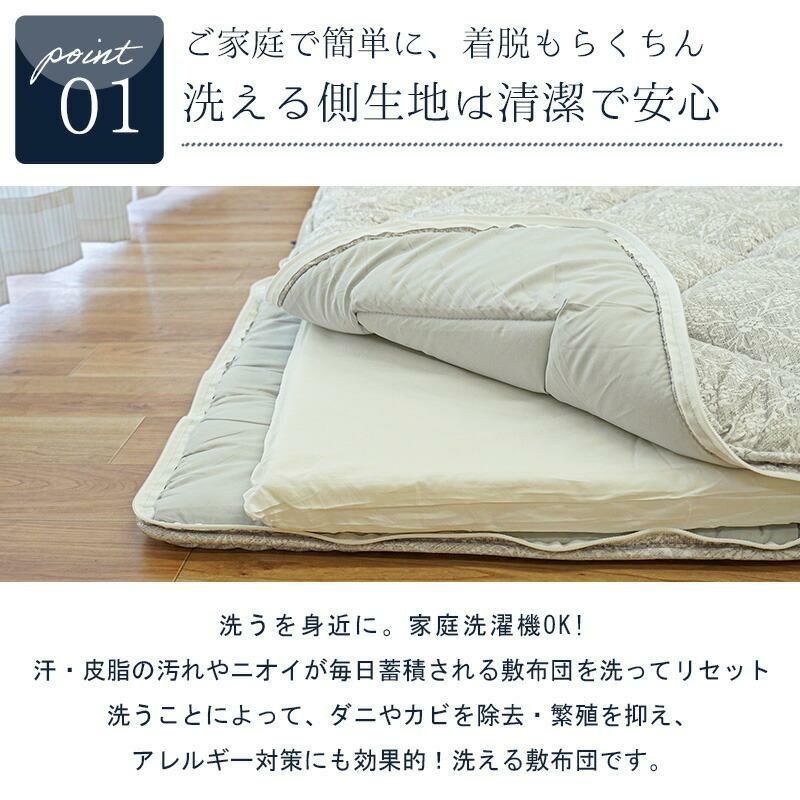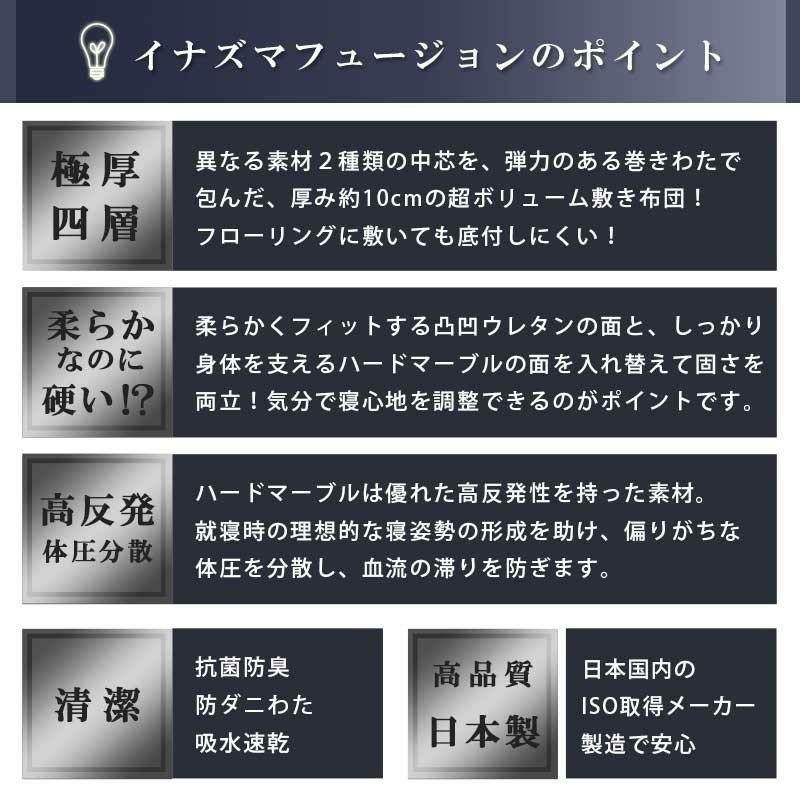 当店のおすすめ敷き布団 フローリングでも底付しない敷き布団 高い高反発性(高弾性)を誇る素材V-Lap® しっかりと身体を支えて、体圧を分散してくれる敷布団です。抗菌防臭・防ダニ効果のあるマイティトップを中綿に採用しています。 もっと見る